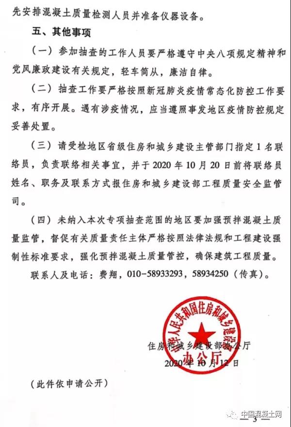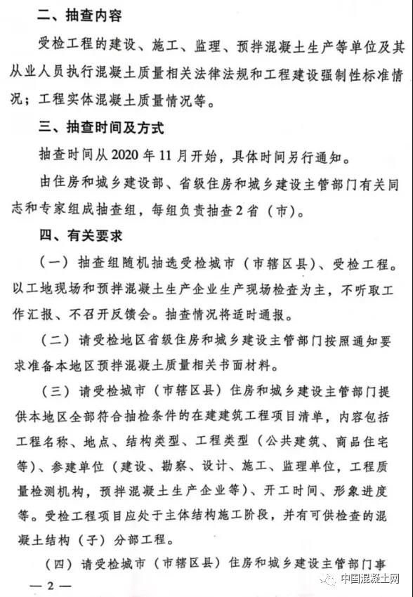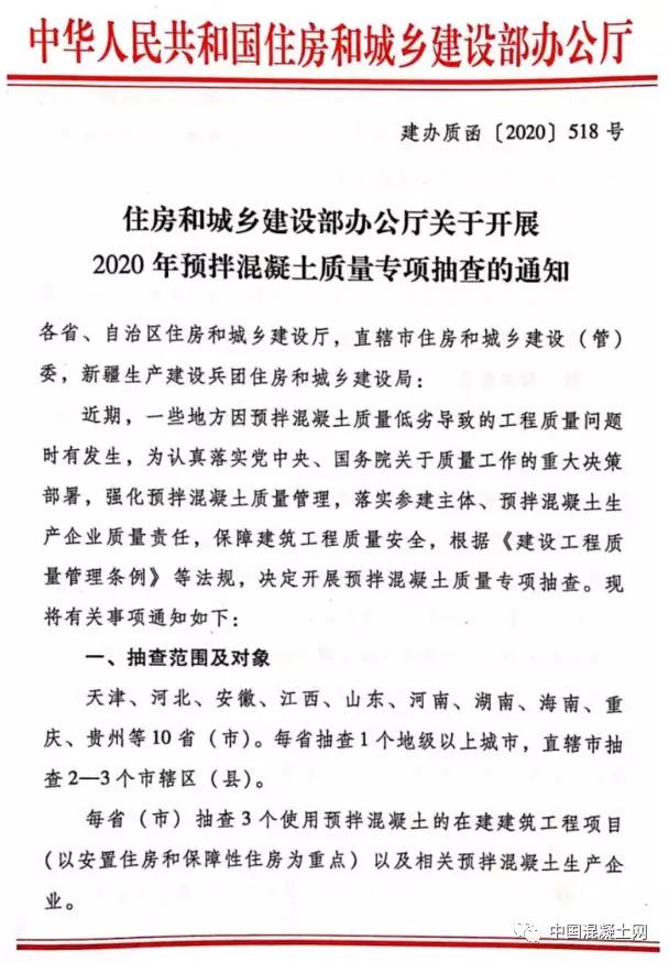 日前,住房和城鄉(xiāng)建設部辦公廳發(fā)布關于開展2020年預拌混凝土質(zhì)量專項抽查的通知稱:近期,一些地方因預拌混凝土質(zhì)量低劣導致的工程質(zhì)量問題時有發(fā)生,為認真落實黨中央、國務院關于質(zhì)量工作的重大決策部署,強化預拌混凝土質(zhì)量管理,落實參建主體、預拌混凝土生產(chǎn)企業(yè)質(zhì)量責任,保障建筑工程質(zhì)量安全,根據(jù)《建設工程質(zhì)量管理條例》等法規(guī),決定開展預拌混凝土質(zhì)量專項抽查,現(xiàn)將有關事項通知如下: